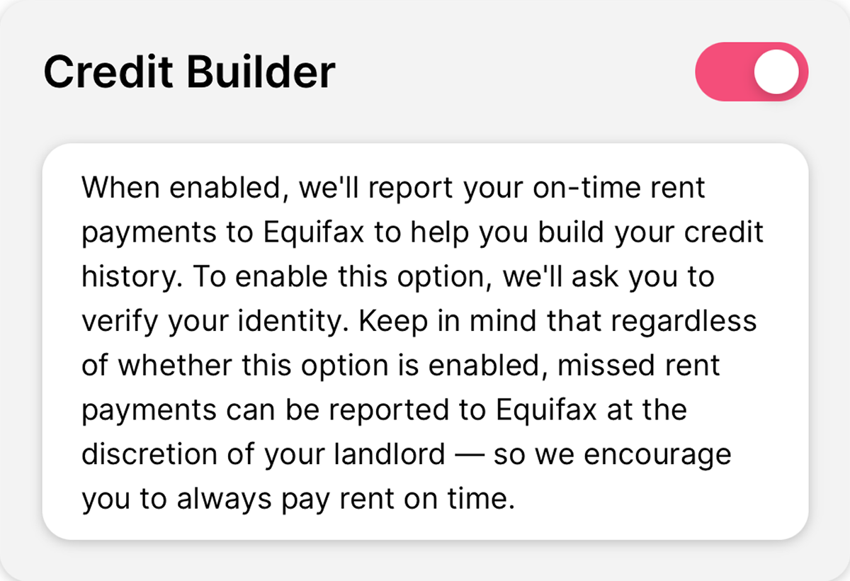 Bonus: Reward on-time payments — Tenants can enroll to report on-time payments to Equifax to build their credit history.